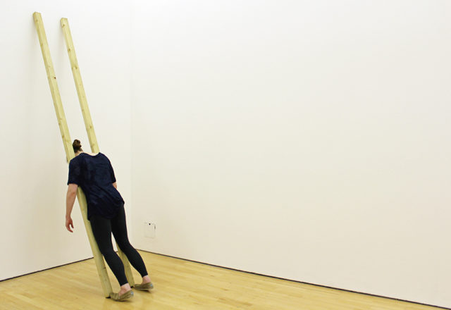 Leah Capaldi is exhibiting the performance Overlay as part of a group exhibition at 16 Nicholson Street Gallery in Glasgow. Other artists in the show include Ross Little and Ani Schulze. In Overlay Capaldi asks a female and male participant to hold a static position, pressing two lengths of wood against the gallery wall, for 30 minutes. No fixings are used. The participants make no eye contact and face the floor, one participant is present on the structure at a time. The performance has previously been presented at the ICA, London, and Crispr, Bogota.